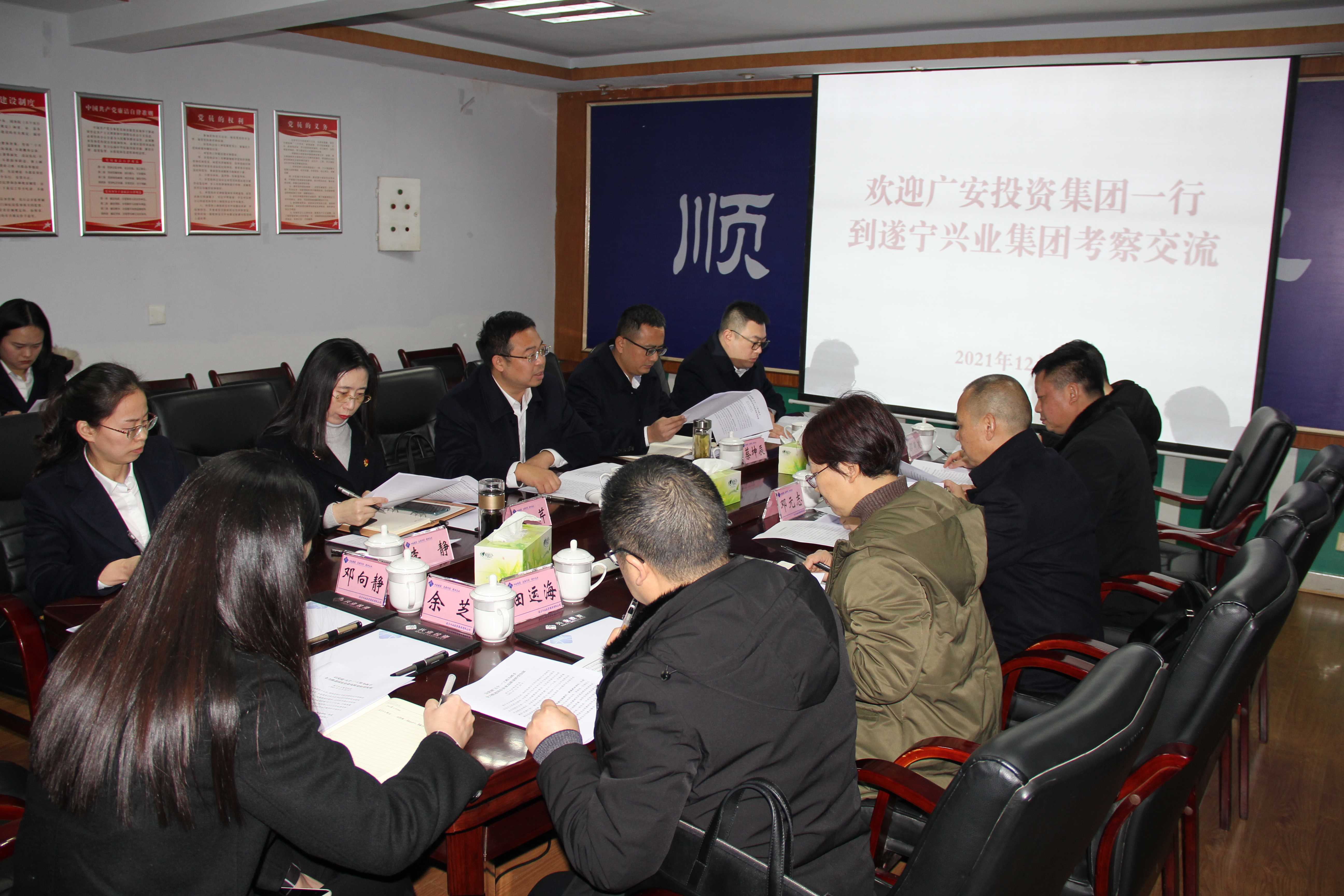 ? ? 2021年12月28日,廣安投資集團(tuán)黨委專職副書記鄧元志,黨委委員、紀(jì)委書記李桂瓊一行7人到遂寧興業(yè)集團(tuán)考察交流學(xué)習(xí)。集團(tuán)黨委副書記、監(jiān)事會(huì)主席、工會(huì)主席石鎮(zhèn)槐,集團(tuán)黨委委員、紀(jì)委書記蔡坤辰陪同考察,并參加座談交流。? ?